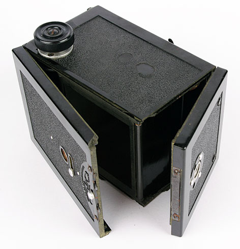 Caractéristiques : Un simili TLR en bakélite datant des années 50. Il reprend la recette du Voigtlander Brillant, du Fex Ultra Reflex et de bien d'autres : un box basique surmontée d'un énorme viseur à miroir pour donner à l'ensemble un look "Rolleiflex". Comme quoi le marketing ça ne date pas d'hier.