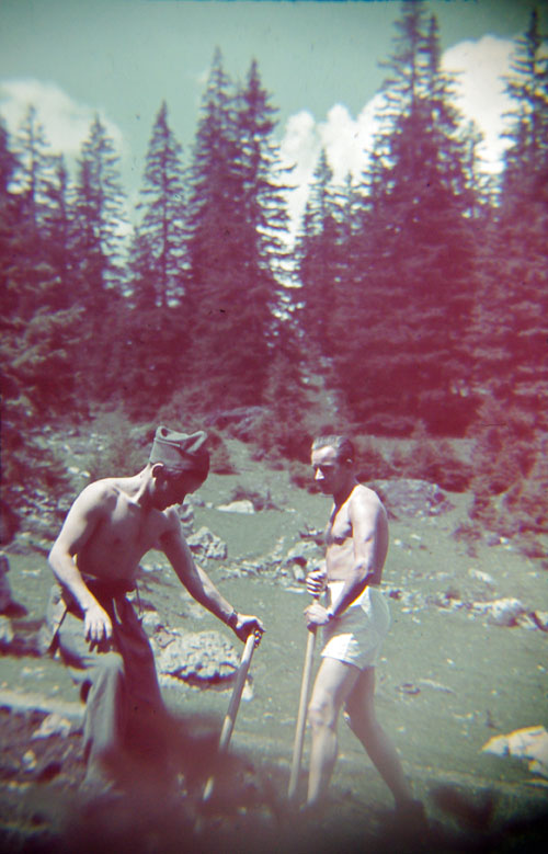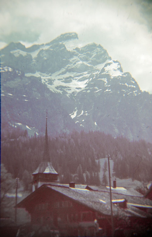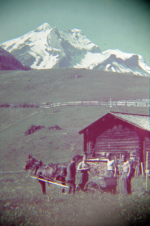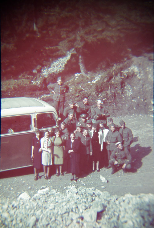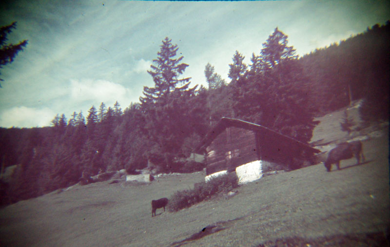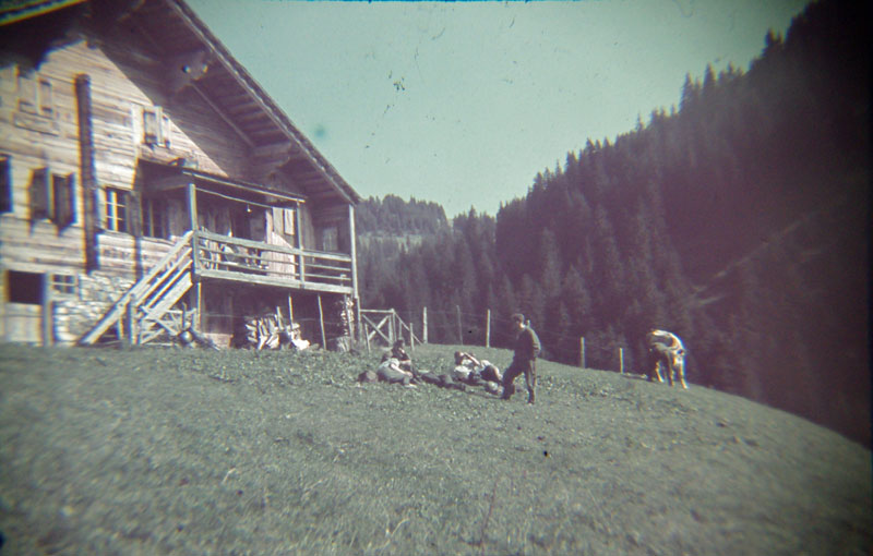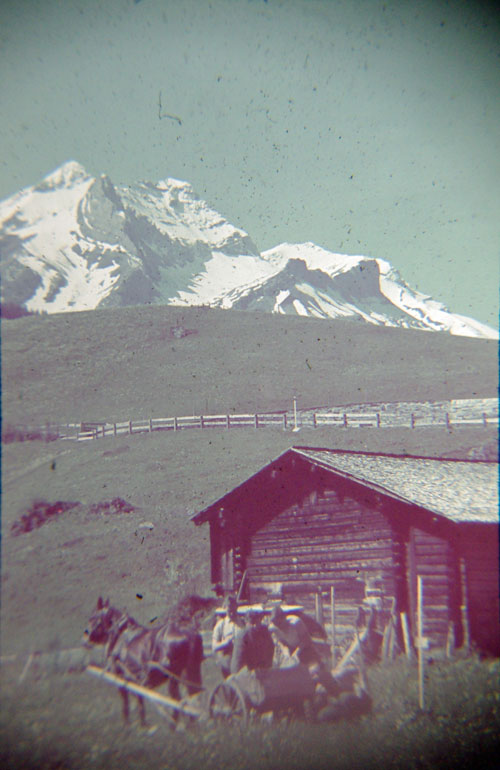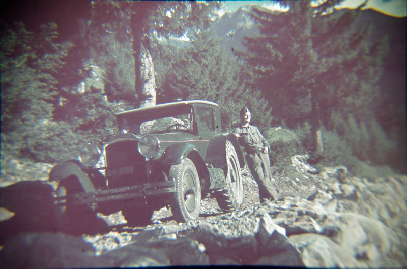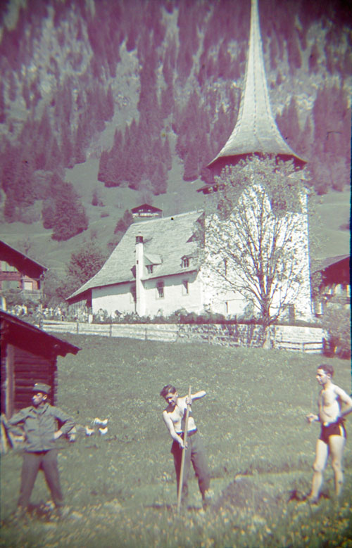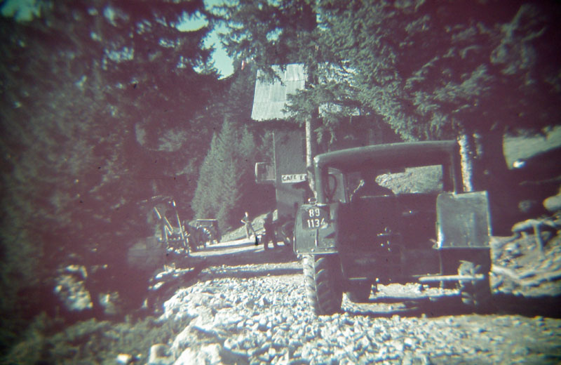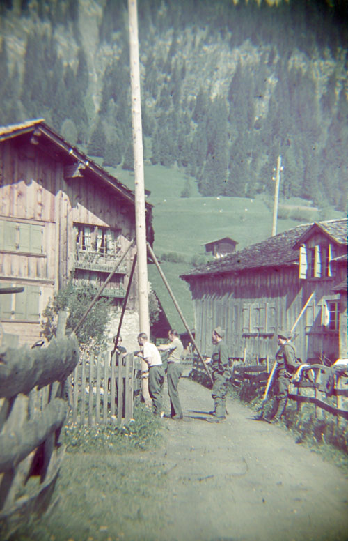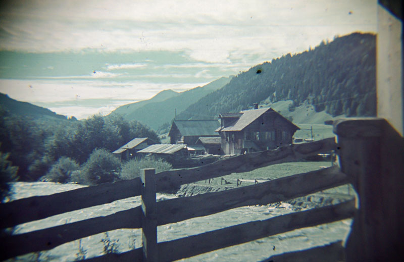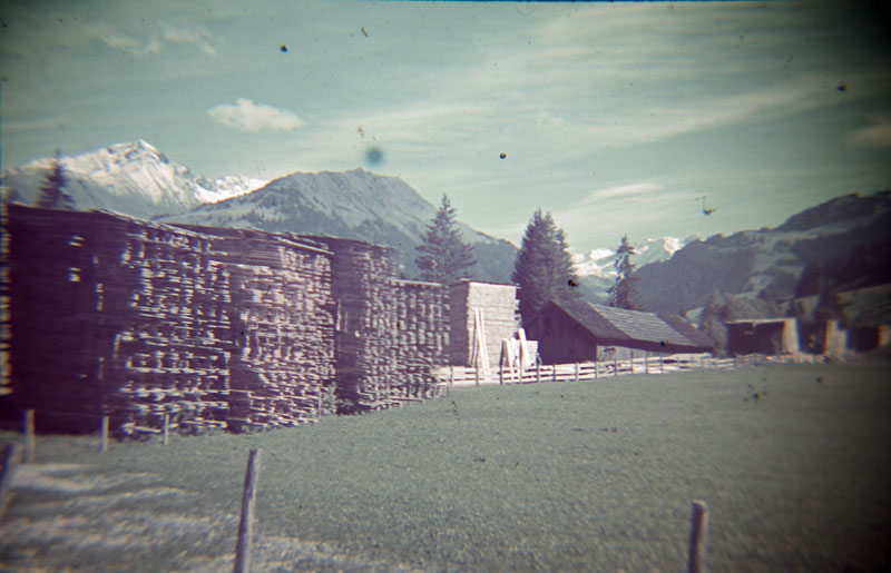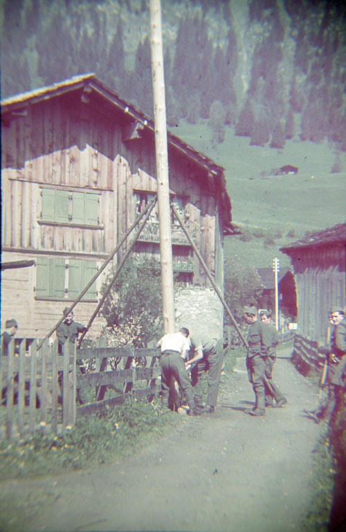 Militaires suissesJe pense qu'il s'agit du même photographe que pour les portraits en studio. Les photos ont manifestement été prises pendant une période militaire. Peut-être un "cours de répétition" normal pour les citoyens suisses mais vu la date probable des prises de vues, ça pourrait aussi être "la Mob" entre 39 et 45. Comme pour l'autre boite de diapositives, la numérisation a été faite à l'aide de la vieille visionneuse Scoparette de mon papa montée "artisanalement" en face de mon reflex numérique. Soyons francs : heureusement qu'il n'y a pas trop de photos d'architecture car ça déforme pas mal. Je pense à une visite des épouses. C'est un peu ce qui me fait penser à la mob. Sur un cours de répétition de trois semaines je ne pense pas que ça se produise (en même temps, j'ai fait mon service militaire en France. Un an pour tirer 10 cartouches à la MAT 45, le pacte de Varsovie pouvait débarquer tranquille :-)