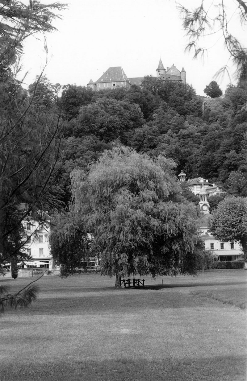 Un bel arbre dans le parc qui occupe le milieu de la station avec le château au-dessus.