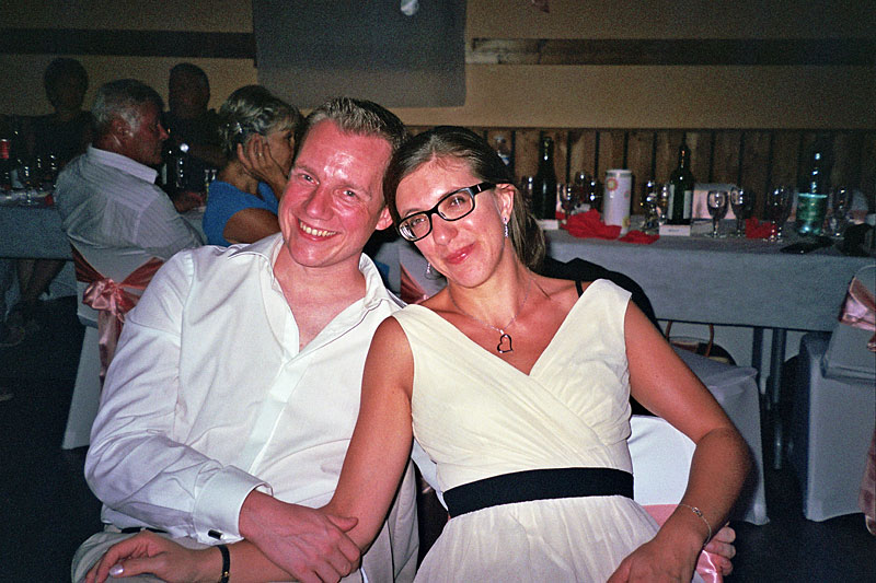 La robe de la mariée masque l'un des corses dont on ne distingue que le bout du manche de la guitare. Avec l'autre chanteur (debout avec le micro) il nous ont offert un super concert de polyphonies. Le guitariste à droite est un copain marseillais du fiston qui, bien que n'ayant rencontré les deux autres larrons seulement la veille, les a accompagné avec talent sur quelques morceaux