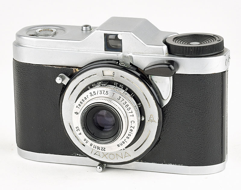 Caractéristiques : 1952. Celui-ci, il a tout pour plaire à un collectionneur : Un marquage exotique (VEB ZEISS IKON au dos avec le logo qui deviendra celui de Pentacon), un format bizarre de 24 x 24, un armement particulier avec un gros bouton qui tombe sous l'index gauche. Le tout en état plus que correct et entièrement fonctionnel ça tourne au rêve :-)